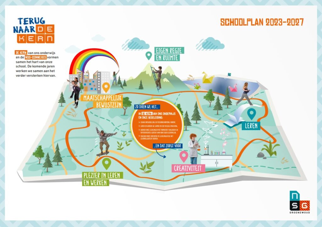 Een routekaart voor de komende jaren en bovenal een inspiratiebron: dat is ons schoolplan 2023-2027 ‘Terug naar de kern’. Hierin beschrijven we – vanuit het hart van NSG Groenewoud – onze visie op onderwijs en begeleiding, en hoe we hier de komende jaren invulling aan geven.